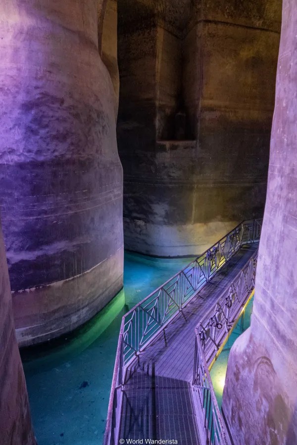 La cisterna presenta pareti in tufo dalla forma arrotondata, rivestite da un intonaco impermeabile, un’antica tecnica per evitare che l’acqua fosse assorbita dalle rocce.
